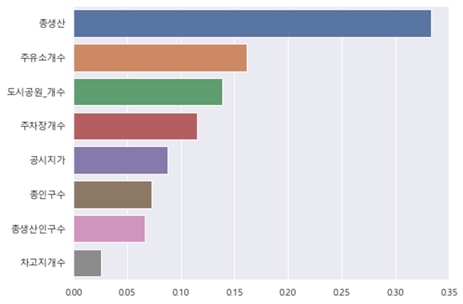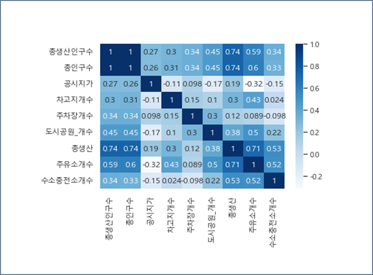 features = ['총생산', '총생산인구수', '수소차대수', '주차장개수', '도시공원_개수', '주유소개수']